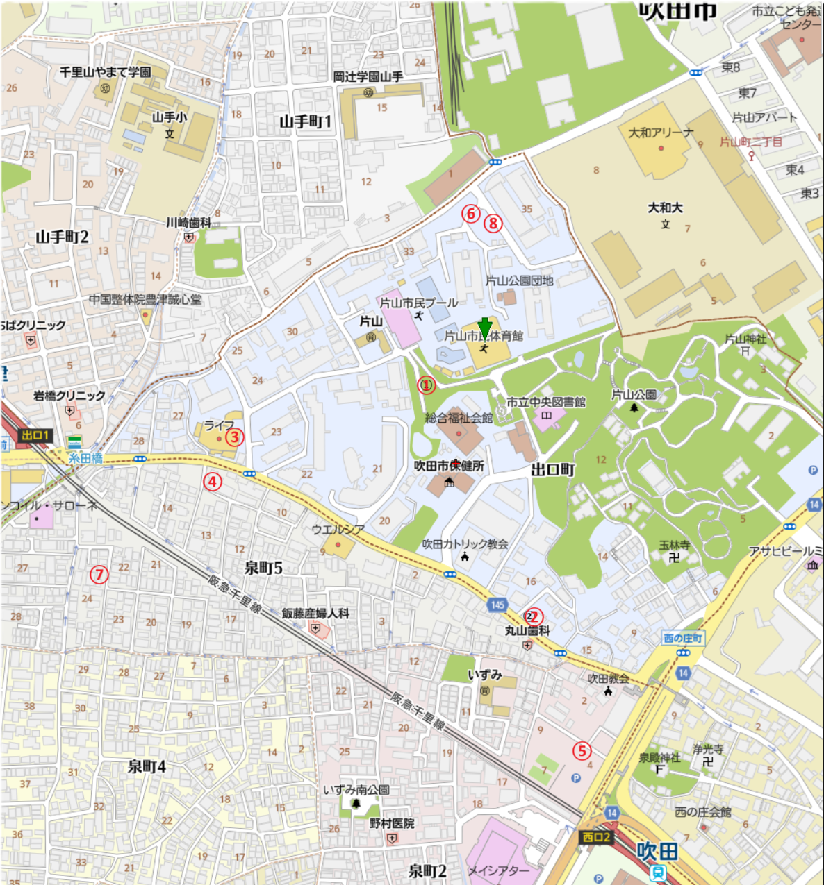 片山市民体育館は片山公園内にありますが、周囲は住居や市の施設が集中し道が狭く入り組み土地も狭隘であることに御留意下さい。